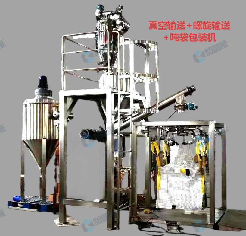 將噸包裝袋套在加料嘴上,將包裝袋四角掛在氣缸上,按動“允加”按鈕,這時壓袋氣缸開始工作并壓住袋口,氣缸將包裝袋四角撐開,控制器將包裝袋重量自動去除,加料螺旋高速轉動迅速將物料灌入袋中,隨袋中空氣一起溢出的粉塵通過吸塵器由除塵器吸走,待加料快到設定值時,加料螺旋進行減速慢加,到設定值時,加料停止。誤差<0.3%。這時壓袋氣缸松開袋口,氣缸將包裝袋四角松開,將包裝袋送至皮帶輸送機上及時送出。